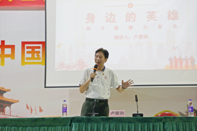9月7日晚上,东莞市爱国拥军促进会副会长兼秘书长卢普润,以“身边的英雄”东莞老兵战斗故事演讲组组长的身份,受邀来到了东莞第一中学的高一新生军训点――大岭山飞娥村,与参加军训的1000多名师生一起,追忆峥嵘岁月,畅谈家国情怀。