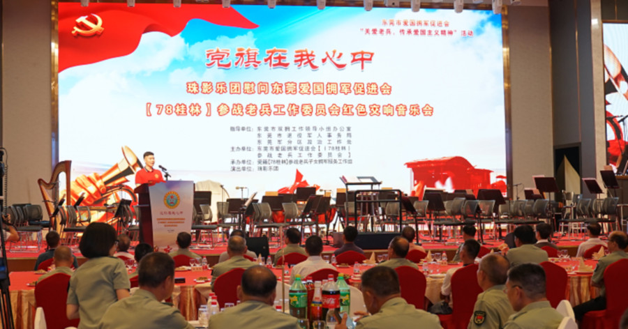 在“八一”建军节到来之际,7月24日下午,东莞市爱国拥军促进会在会展酒店举行“关爱老兵,传承爱国主义精神”活动――“党旗在我心中”珠影乐团慰问东莞市爱国拥军促进会78(桂林)参战老兵工作委员会红色交响音乐会。200多位78(桂林)参战老兵携家人一起参加活动,战友们欢聚一堂,共叙战友情谊,重温中国共产党走过的100年光辉历程。