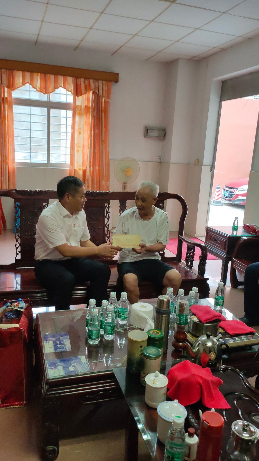 长安镇委书记叶孔新,镇委副书记、镇长肖洪和东莞市爱国拥军促进会会务工作人员邓健良等组成慰问团,兵分两路,深入社区,走访慰问麦柏根烈士父亲麦洪太和邓万兄烈士弟弟邓祥兄,向他们送上党和人民的关怀。