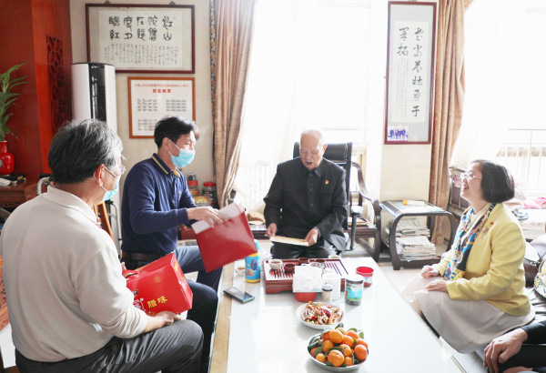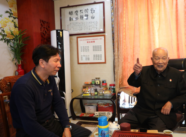 1月25日,受莫浩棠会长的委托,秘书长卢普润会同塘厦镇分管退役军人工作的副镇长陈广莲、以及该镇的退役军人服务中心党支部副书记罗观弟一起,登门慰问东江纵队老战士邝耀水。年逾百岁的邝老精神矍铄,谈笑风生,还亲自斟茶倒水,和来访的后辈们聊起自己的战友,讲述当年的战斗故事,分享自己参加我会举办的《爱国双拥固长城》庆祝建军90周年晚会时的开心和快乐。言谈中,邝老非常关心东莞市爱国拥军促进会的工作,希望后辈们努力,一起为东莞的爱国拥军工作做出贡献。