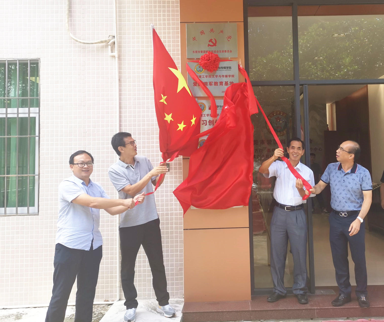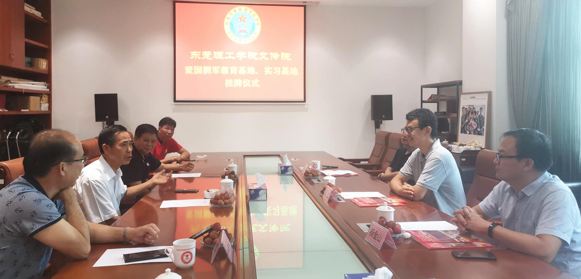 2020年6月15日上午,东莞理工学院文学与传媒学院党委书记阎江,党委委员、传媒系副主任杨金山,传媒系党支部书记郑路等3人来到东莞市爱国拥军促进会,受到了会长莫浩棠,常务副会长易志兵、梁景棠等领导的热烈欢迎。
