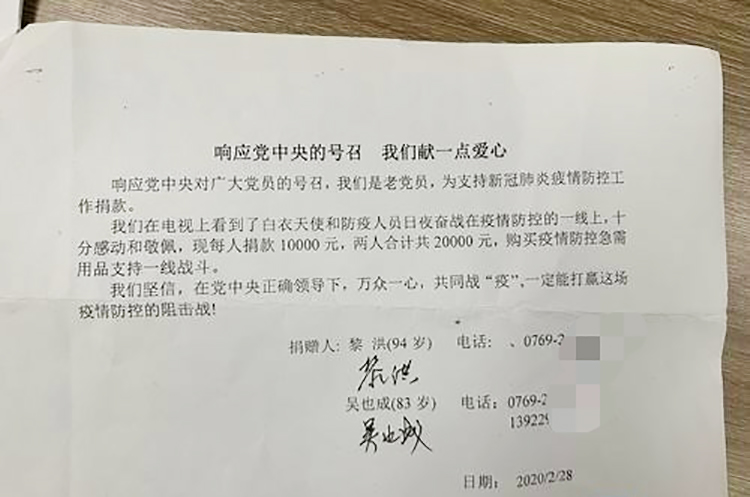 东莞两位90多岁的抗战老兵、老党员黎洪、吴也成从电视上看到医务工作者和众多疫情防护工作人员日夜奋战在一线,两位老党员一心想着要为防疫工作做点什么,于是,他们来到兴塘社区找工作人员询问能否捐款支持防疫工作,在工作人员的全力帮助下,两位老党员终于完成心愿,将2万元捐款买成防疫物资支援战疫一线。