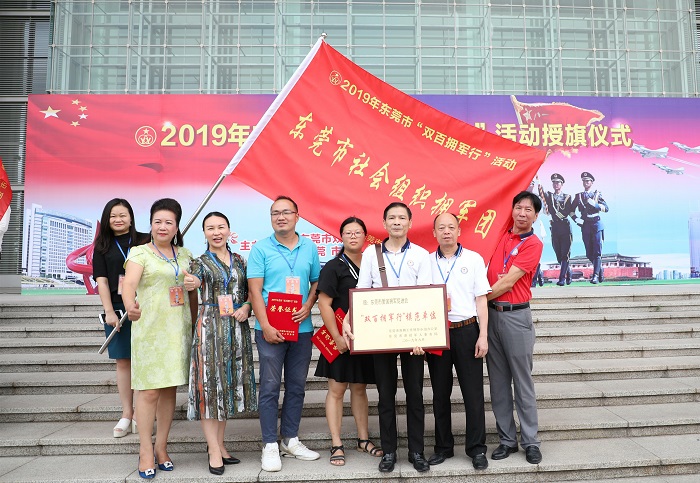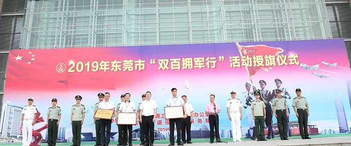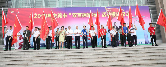 2019年9月26日上午,由东莞市双拥工作领导小组、东莞市退役军人事务局主办的东莞市2019年“双百拥军行”活动,在市会议大厦西门广场举行授旗仪式,拉开了“双百拥军行”序幕。市双拥办常务副主任、市退役军人事务局局长温颂钧、副局长袁子健、双拥办专职副主任卓军,驻军部队领导,以及由社会企业、企业家、社会组织组成的14个拥军团队150人出席活动,兵分14路,深入驻莞部队慰问基层官兵。市退役军人事务局局长温颂钧、东莞军分区政治工作处主任吴新征,拥军团队代表、东莞市爱国拥军促进会秘书长卢普润先后上台讲话,东莞市工商联(总商会)副主席、东莞世界莞商联合会常务副会长、东莞市女企业家商会会长、东莞市爱国拥军促进会名誉会长方桂萍代表社会组织拥军团接受“拥军旗”。