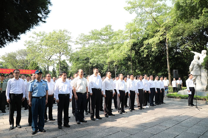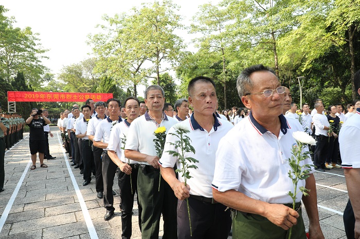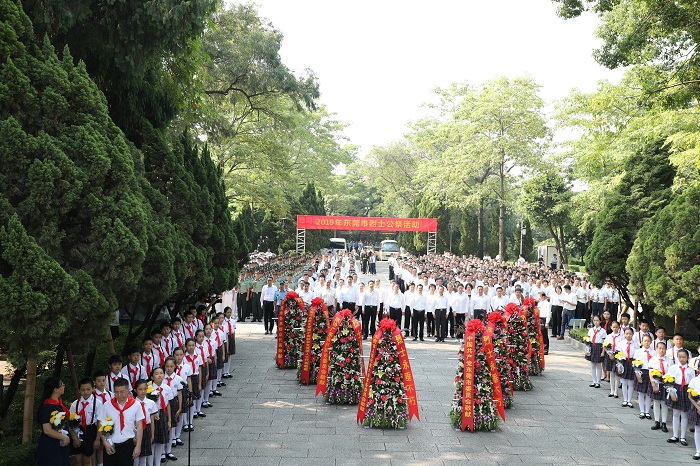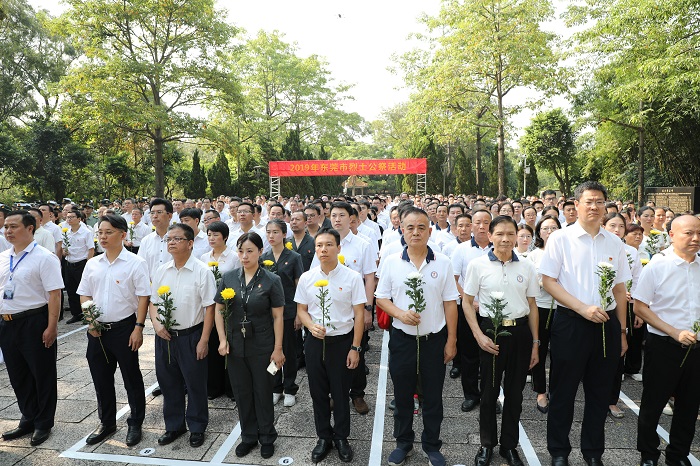 在新中国成立70周年之际,9月30日上午,东莞市烈士公祭活动在人民公园革命烈士纪念碑广场隆重举行。市四套领导班子成员,东莞军分区领导,市委、市政府秘书长,市直正处以上单位、中央和省驻莞有关单位主要负责同志,莞城、东城、万江、南城四个街道党委书记、办事处主任,军烈属、老战士、先进党员、老同志代表,各民主党派、工商联及无党派人士代表,工人、农民、市民、学生、公安干警、武警官兵、驻莞部队官兵以及参战退役人员代表共750多人参加纪念活动。