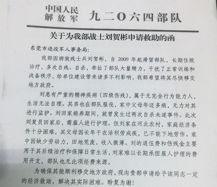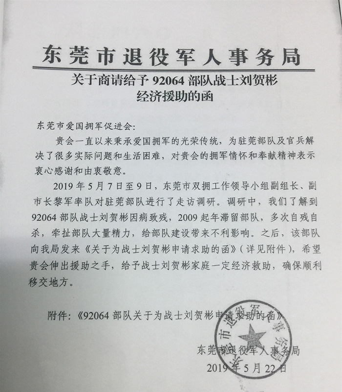 今年五月中旬,我会和市退役军人事务局同时收到部队求助函,要求协助解决现役军人刘贺彬重大疾病和家庭特殊困难问题,本来按照现行政策的属地解决原则,刘贺彬的问题应该属于部队和刘的原籍河北省保定市协调解决,河北省保定市又觉得刘还没有真正移交地方,但部队又没有这项经费,觉得非常为难,于是,同时向我会和市退役事务局发出求助函,获悉情况的黎军副市长和市退役军人事务局的领导高度重视,多次与我会协调沟通,最后由我会向部队伸出援手。在5月26日我会派出秘书长到刘贺彬所在部队调查了解,刘贺彬,河北省保定市人,2004年入伍,弟弟刘贺涛在东部战区海军舟山基地当兵,老家保定市只有年近花甲的父母,家庭比较困难,为此,我会于6月10日向九二零六四部队捐赠8万元,及时地为驻莞部队解决疑难。