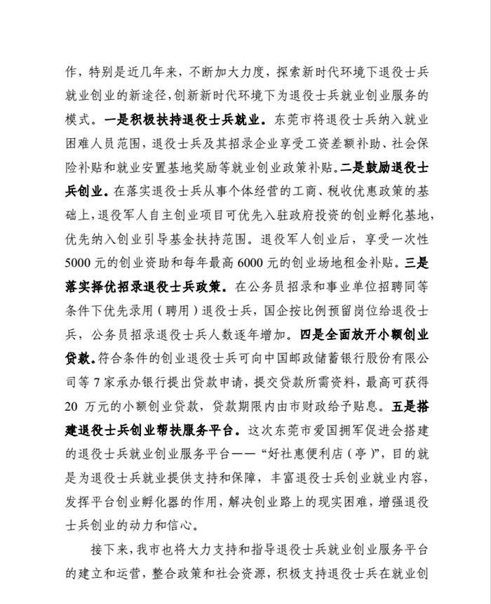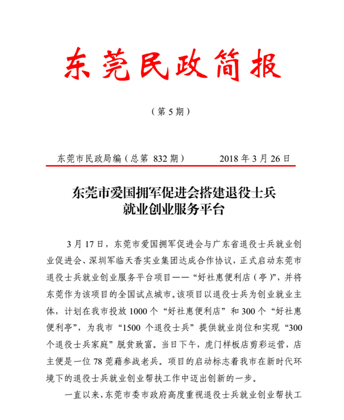东莞市爱国拥军促进会搭建退役士兵就业创业服务平台――《好社惠•便利店、便利亭 》,目的就是为退役士兵就业提供支持和保障,丰富退役士兵创业就业内容,发挥平台创业孵化器的作用,解决创业路上的现实困难,增强退役士兵创业的动力和信心,这个项目得到了市委市政府的大力支持,在市民政局编发的第5期《东莞民政简报》里详细报道了项目情况,将大力支持和指导退役士兵就业创业服务平台的建立和运营,整合政策和社会资源,积极支持退役士兵在就业创业中的技能培训、技术支持、税费优惠、财政扶持、创业项目、创业贷款、创业经验和资金等方面的需求,千方百计解决退役士兵在就业创业遇到的问题和困难,让我市退役士兵能充分发挥自身优势,励志以创业促就业,不忘军人初心本色。