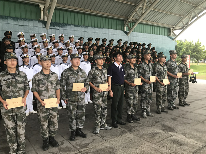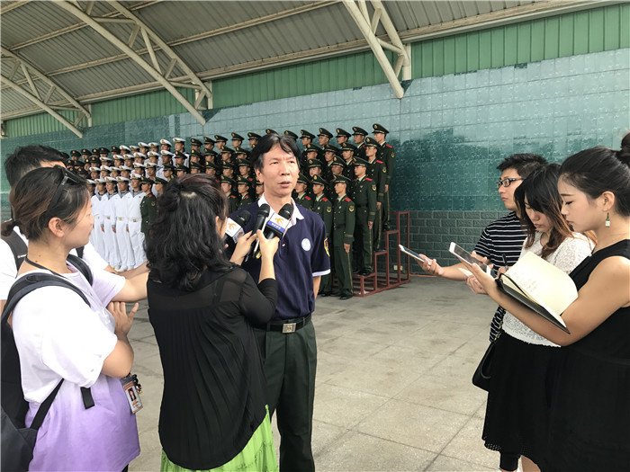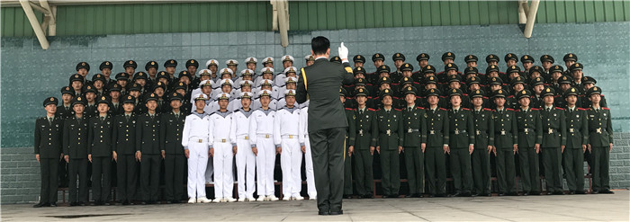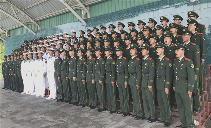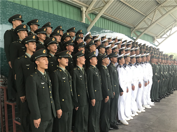 在探班现场,只见战士们冒着酷暑,身着军装,精神饱满地在老师的指挥下,一遍一遍地唱歌、背词、纠正每一个字的读音。战士们认真排练,一丝不苟的军人作风受到媒体记者的好评。一位海军战士中暑了,一首歌还没唱完,他觉得自己有点站不住,就紧紧地拉着旁边战友的手,始终以挺拔的军姿站在队里,直到一首歌完成,小战士才出列,坐在一边休息、喝水。