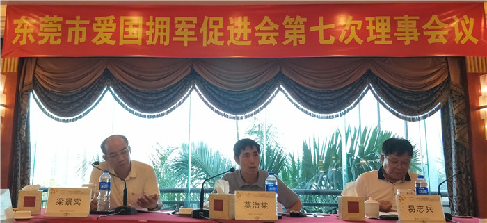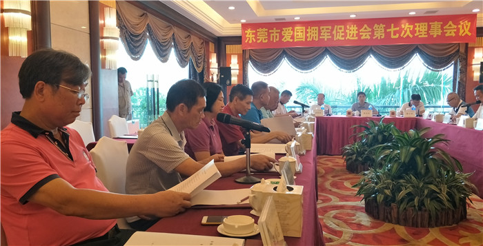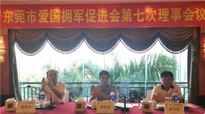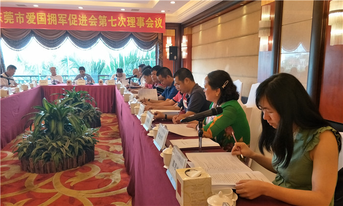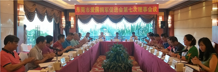 为筹备庆祝建军90周年暨我会成立三周年晚会,东莞市爱国拥军促进会召开第七次会议。6月27日下午,东莞市爱国拥军促进会在塘厦三正半山酒店召开第七次理事会、会议由莫浩棠会长主持,常务副会长易志兵、梁景棠、以及常务理事、副会长、理事、等26人出席会议,出席第七次理事会议人数符合《章程》的要求。