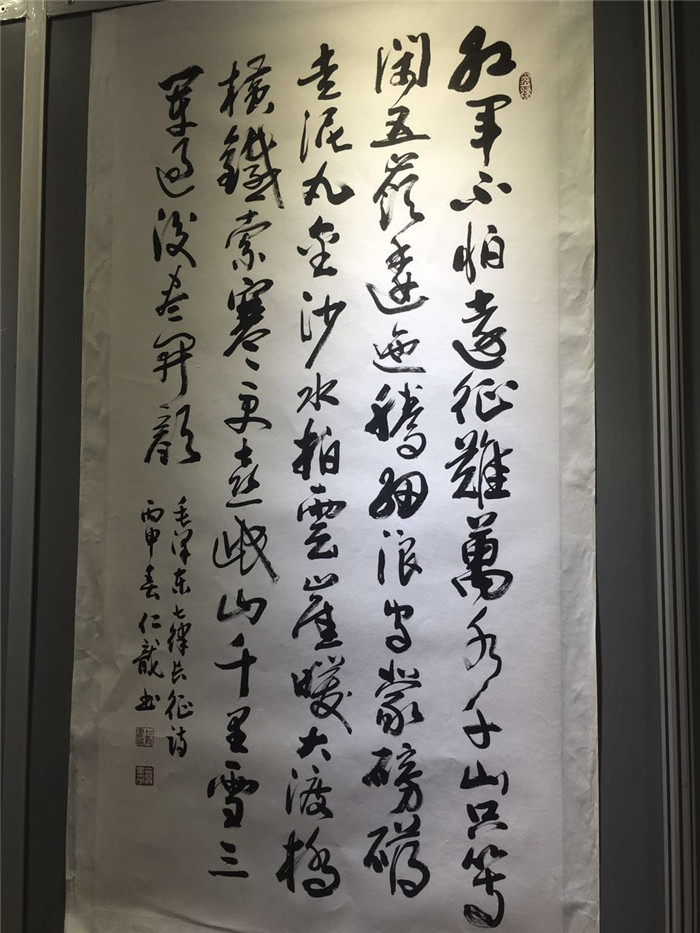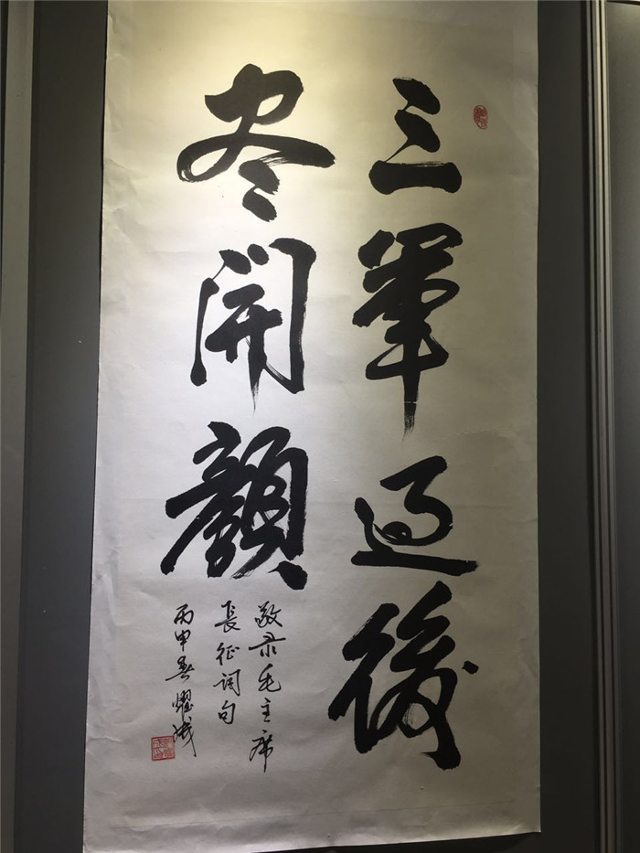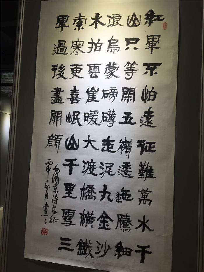 本次参展书画作品紧扣时代脉搏,内容丰富、积极向上,书体种类齐全,具有很高的观赏性和艺术价值。作品多以毛泽东的诗词为主,如《七律.长征》这首气势磅礴的史诗就有多种书法艺术出现在观众面前,各种字体别具一格,很具艺术震撼力,在欣赏作品的同时,观众会情不自禁地回忆起红军历尽艰难险阻的伟大长征。这些书画作品反映出将军们对早日实现中华民族伟大复兴的“中国梦”的热切期盼,也让观展的人们受到深刻的爱国主义教育。