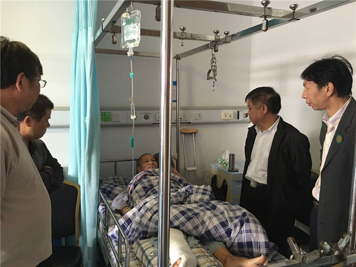 2015年12月1日上午,东莞市爱国拥军促进会秘书处接到会员黄良根的电话,反应退役老兵卢锐林因交通事故入住在东莞中医院骨科。秘书处核实情况后,在常务副会长易志兵的带领下,一行五人来到卢锐林的病床前看望他,对他虚寒问暖,并详细了解他受伤情况、家庭经济和生活状况。易副会长跟卢锐林说,如果在治疗中遇到困难,可直接找爱促会反应,或是向当地社会事务办提出求助申请,卢锐林听说后,感动不已。