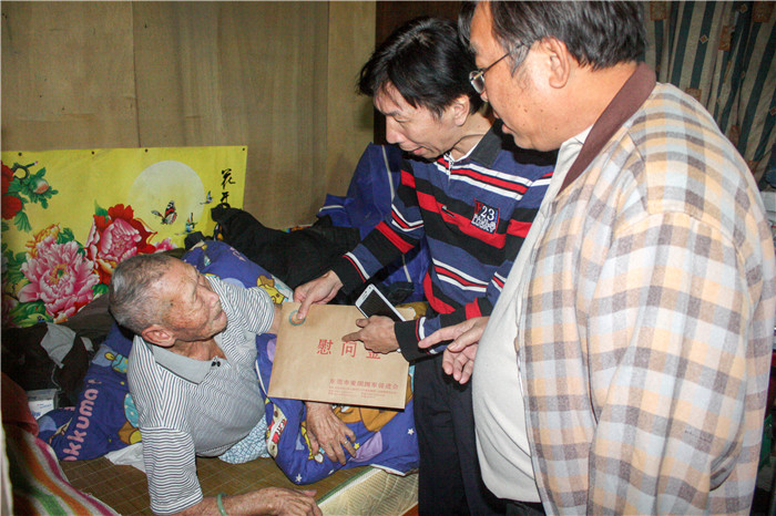 日前,东莞市爱国拥军促进会秘书处在接到厚街镇社会事务局的求助申请后,于2015年11月27日下午,由爱国拥军促进会秘书处工作人员一行4人,带着全体会员的深切关怀来到厚街双岗村探望因不小心摔倒而导致腿骨折的抗战退伍老兵陈彭年并送上慰问金一万元。