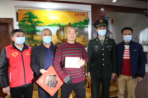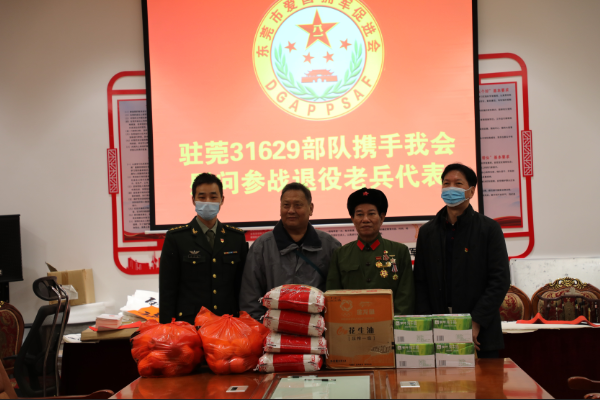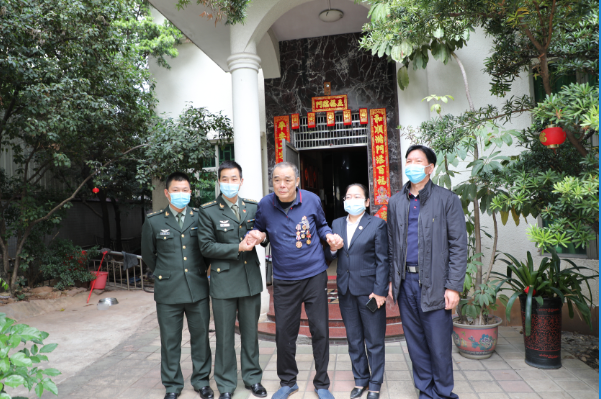 2022年1月14日上午,31629部队的官兵代表,受旅党委的委托,携手中共东莞市爱国拥军促进会党支部,组成慰问团,分别到莞城、南城、厚街、沙田、道滘、麻涌,中堂等镇,对特殊困难的参战老兵10名代表开展送温暖行动,为他们送去春节的祝福和关怀。