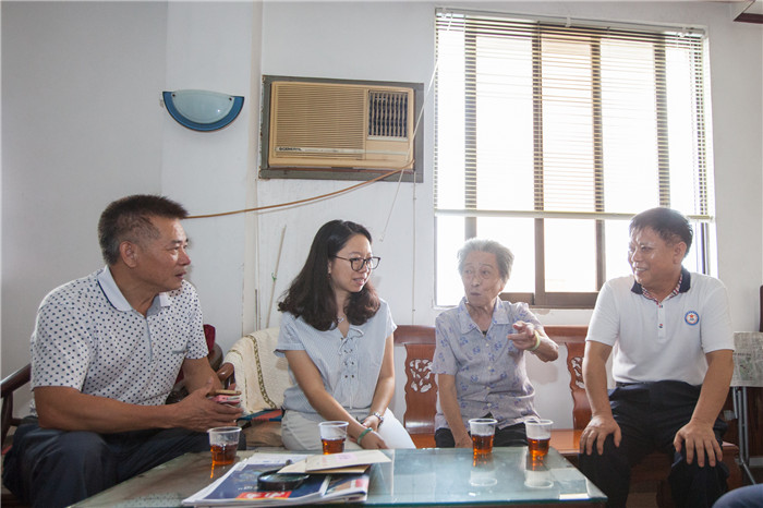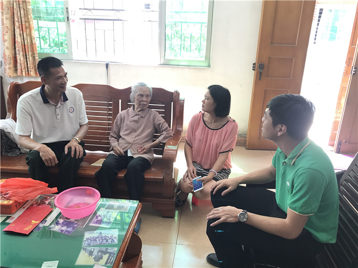 在万江区烈士叶达祥的家里,常务副会长梁景棠紧紧地握着烈士母亲龙婉芳老人的手,和她一起拉家常。龙妈妈虽然身体稍有不适,需要人搀扶才能行走,但她性格开朗,说起自己的生活,她还即兴唱起了自己编的咸水歌,歌词里都是歌颂党,感谢政府关心的内容,每一句都发自龙妈妈的内心。