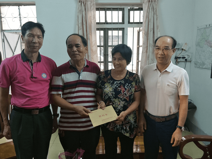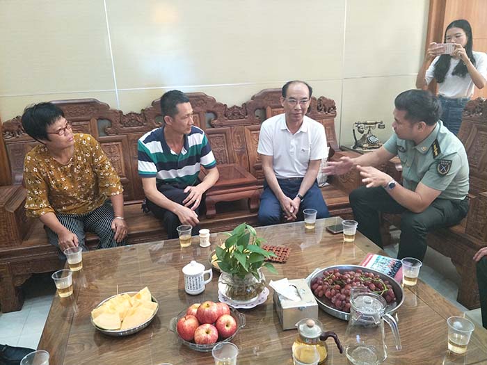 2018年8月17日下午,我会常务副会长梁景棠带领秘书处工作人员,在军分区参谋长杨志越引领下,来到寮步镇,在该镇党委委员、武装部部长梁伟侬、社会事务局局长刘冠华等领导的陪同下,分别探访慰问现役军人祁楚东和刘淑欣的父母。