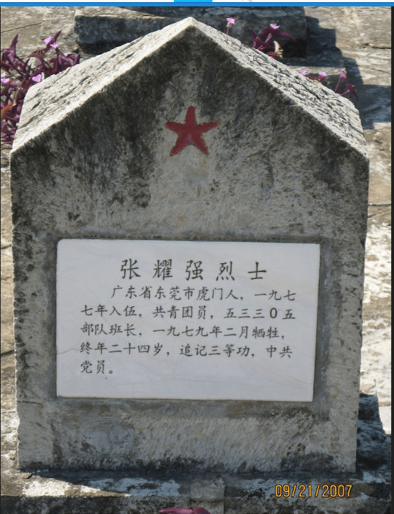 张耀强烈士,广东省东莞市虎门人,1976年12月入伍,在某部127师379团2营6连当战士,后升任班长。1979年2月的对越自卫还击战中牺牲,终年24岁。追记三等功,共产党员。