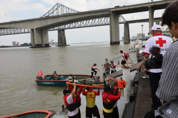 突然间,指挥部导调组发出指令,需要到某水域接运伤员上岸救护,水上支前救护队立即登上冲锋舟,10多分钟后,水上救护队接着伤员回到码头,早在码头等候的陆上救护队,根据伤员的伤势轻重,进行临时处治,并通过救护车,送往医院进一步救治,随着装载伤员的救护车驶离码头,演练结束。