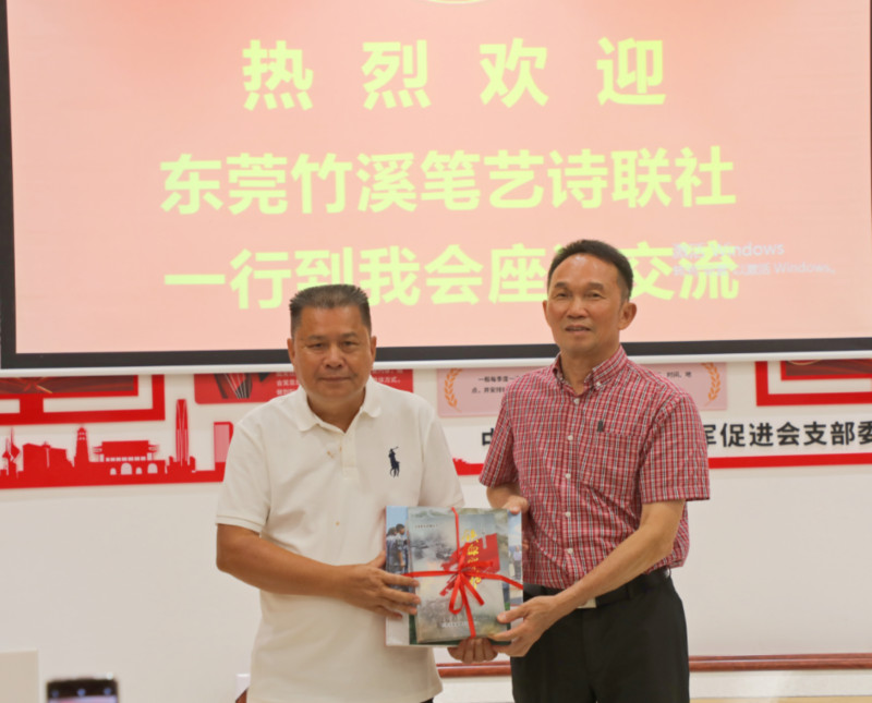 东江诗社社长、东莞竹溪笔艺诗联社顾问卫兆元在交流中特别激动,他说自己也是一名退役军人,曾在陆军某部文艺宣传队服役,来到爱促会感到特别的亲切,尤其在得知爱促会为退役老兵们做了这么多暖心的事后有感而发,即兴现场作诗一首《东莞市爱国拥军促进会颂》: