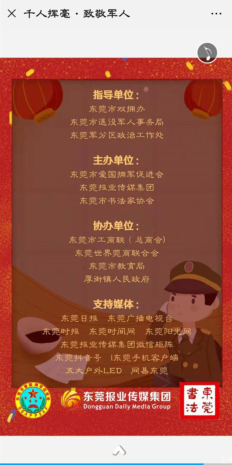 “千人挥毫,致敬军人”东莞市迎春送福文化拥军活动征联环节今日启动