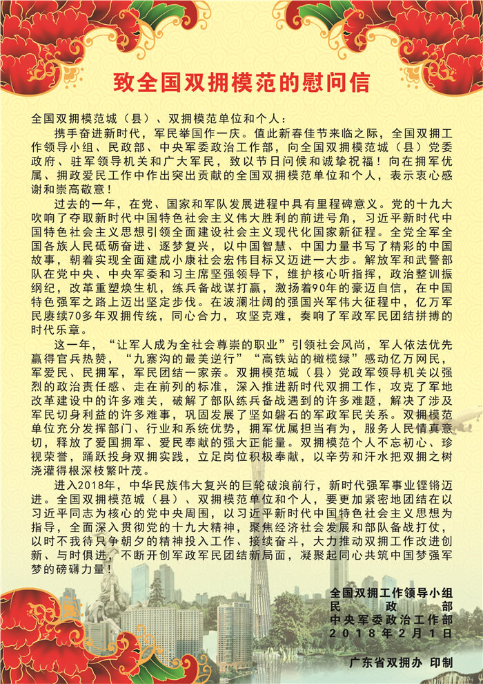 致全国双拥模范的慰问信、致广大官兵和优抚对象的慰问信