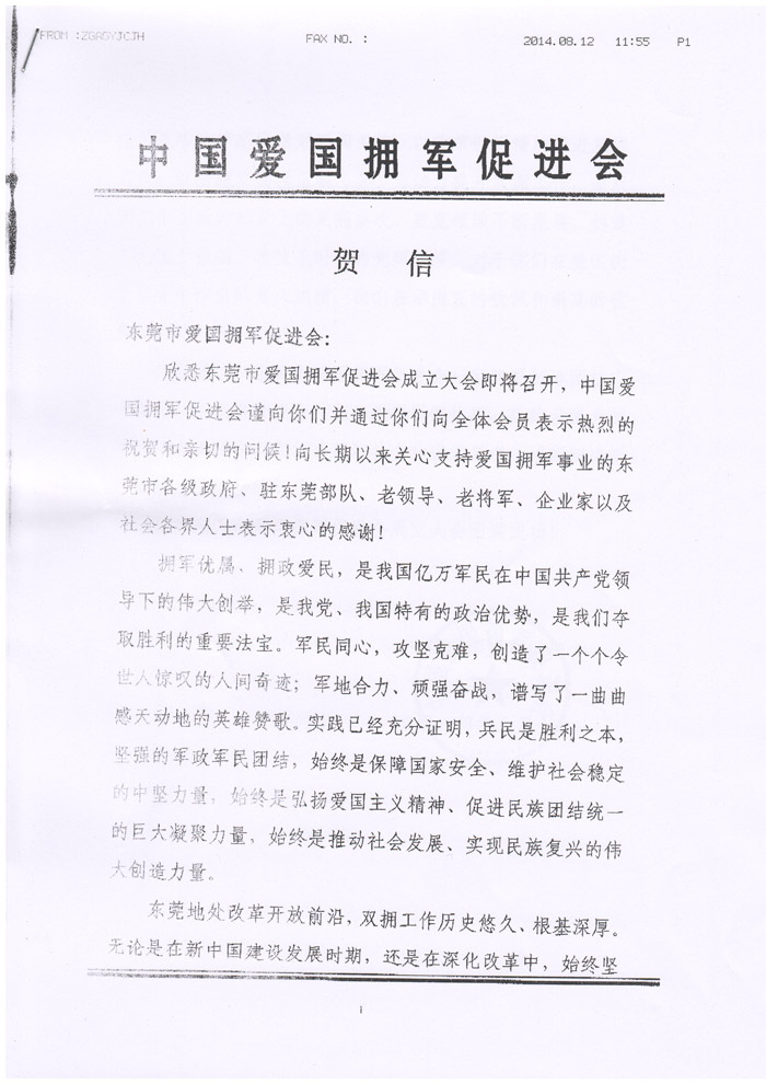 中国爱国拥军促进会祝贺东莞市爱国拥军促进会成立