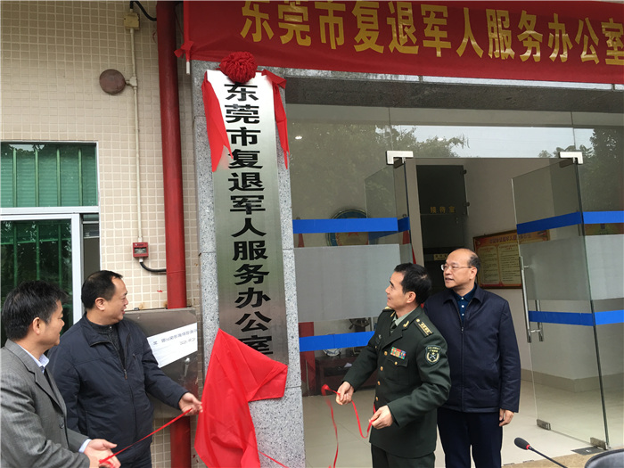 省民政厅副厅长陈奇、优抚处处长韩明、东莞军分区政委刘卫芳、市民政局局长莫淦泉为东莞市复退军人服务办公室揭牌