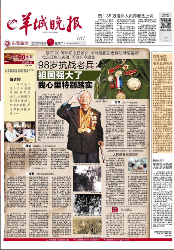 2017年8月1日是中国人民解放军建军90周年纪念日。在这个特殊的日子来临前夕,家住东莞塘厦的原东江纵队98岁高龄老兵