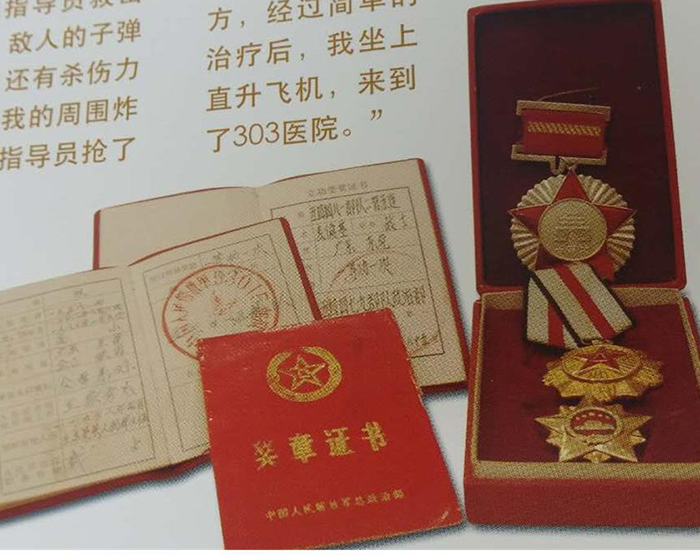 “我几乎是由战友架着,跟着部队前进,腿上的伤口非常疼痛,还在流血,这样坚持了一天之后,在一个战斗间隙时,战友们把我送上了民工的担架,开始往后方撤退。谁知,担架队走了没多远,就遇上敌人的伏击,抬担架的民工一听到枪声,把单架往小路边一丢就跑走了。此时,在黑夜中,我一个人坐在不知道方位的小路上,又冷、又急、又饿、又怕。一个无法行走的伤员,手中没有任何武器,坐着只有等死,非常危险,随时都可能有敌人走过来把你打死,怎么办?我拖着疼痛的双腿,开始往路边的草丛里爬,我要躲藏起来,不能让敌人抓住。我爬一会又要停下来,因为我的膝盖骨皮很快就磨穿了,鲜血粘住了裤子,疼得我不知道晕过去多少次,但每一次醒过来,我都在心里下决心:就是爬也要爬回祖国去,我要重新站起来,要重返战场,要和战友们并肩作战,就是这样的信念在心中,支撑着我白天躲,晚上爬,一直坚持了7天7夜,终于等到了一支前来打扫战场的部队,战友在草丛里发现了奄奄一息的我,马上把我送到后方,经过简单的治疗后,部队把我送上直升飞机,来到303医院开始了漫长的康复治疗。”
