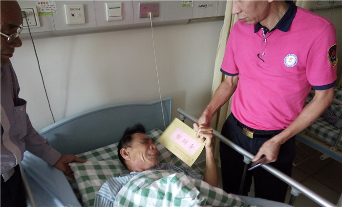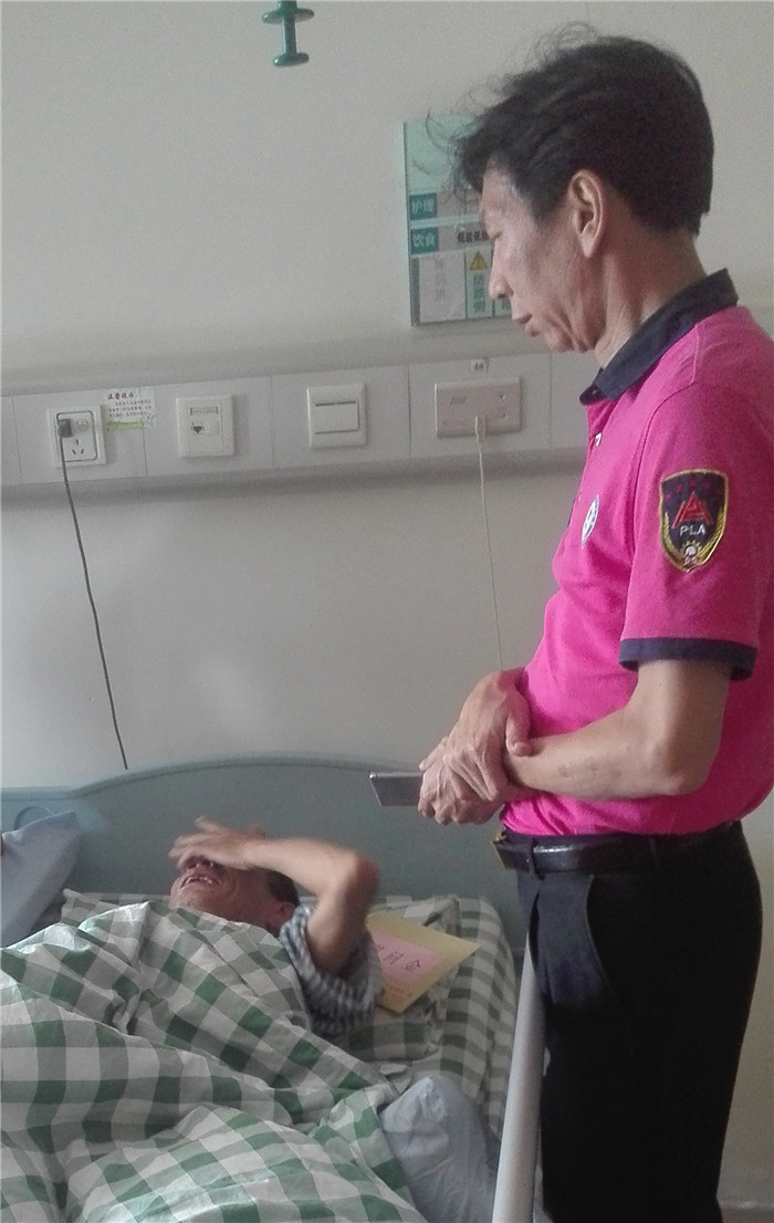 看到爱促会的工作人员这么关心自己,躺在病床上的陈润洪很感动,在握手的那一刻,他眼泪止不住地往下流,他说,爱促会真是我们老兵的贴心人。