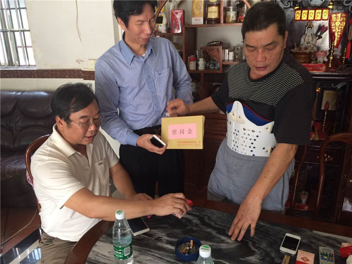 企石镇78年度参战老兵王晃权由于身体欠佳,腰椎间盘出了毛病。在东莞中医院住院了一个多月,做了腰椎部位的手术。虽然没有严重到危及生命的地步,但回到家里调养,感到处处不顺心,行走不便坐立不安,整个人不见了以前谈笑风生的脸容。原本健壮的身躯显得有点消瘦,天天在家闷闷不乐。王晃权的战友们知道情况后,也经常去探望他,并且也把王晃权的有关情况向爱促会副秘书长卢普润作了汇报。4月6日,卢普润和陈海良一起专程来到企石镇,连同东莞七八(桂林)战友互助会企石分会长刘旭林一道,到企石镇南坑村,探望慰问养病在家的王晃权战友,并发放了慰问金。