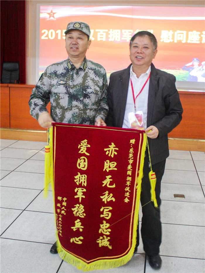 “双百拥军行”活动是东莞唱响社会化拥军的时代赞歌,是在全社会传播爱国拥军的正能量,是为实现 “中国梦”、“强军梦”贡献力量。东莞市爱国拥军促进会成立一年多以来,第一次受邀参加“双百拥军行”,在莫浩棠会长的亲自发动下,筹集了40万的拥军经费,为75270部队援建多功能影视厅。