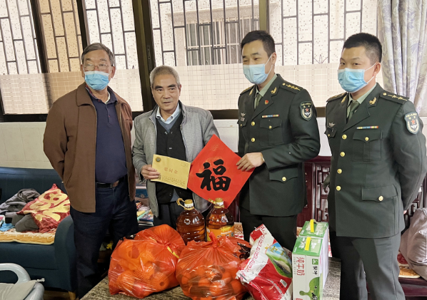 2022年1月14日上午,31629部队的官兵代表,受旅党委的委托,携手中共东莞市爱国拥军促进会党支部,组成慰问团,分别到莞城、南城、厚街、沙田、道滘、麻涌,中堂等镇,对特殊困难的参战老兵10名代表开展送温暖行动,为他们送去春节的祝福和关怀。