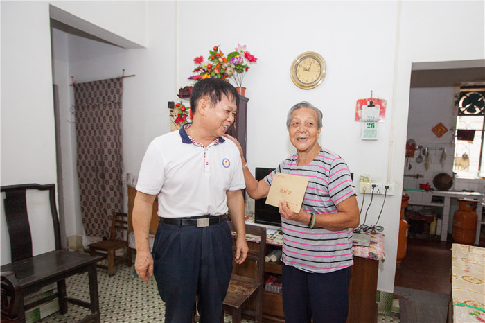 在万江区烈士叶达祥的家里,常务副会长梁景棠紧紧地握着烈士母亲龙婉芳老人的手,和她一起拉家常。龙妈妈虽然身体稍有不适,需要人搀扶才能行走,但她性格开朗,说起自己的生活,她还即兴唱起了自己编的咸水歌,歌词里都是歌颂党,感谢政府关心的内容,每一句都发自龙妈妈的内心。