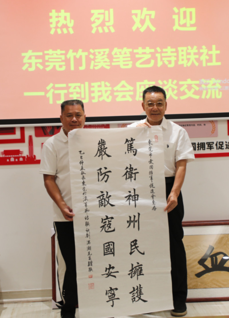 东江诗社社长、东莞竹溪笔艺诗联社顾问卫兆元在交流中特别激动,他说自己也是一名退役军人,曾在陆军某部文艺宣传队服役,来到爱促会感到特别的亲切,尤其在得知爱促会为退役老兵们做了这么多暖心的事后有感而发,即兴现场作诗一首《东莞市爱国拥军促进会颂》: