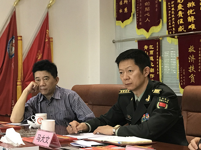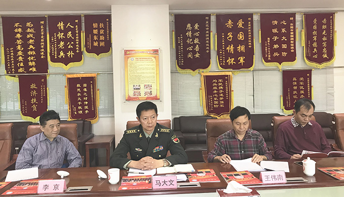 2018年3月16日上午,中央军队退役人员稳定工作专项督导组成员、中央军委政治工作部和文职人员局补充退役处副师职干事马大文在省委政法委专职委员李京、省委政法委五处副处长王平以及市委政法委专职副书记王伟南、市民政局调研员王国雄陪同下来到东莞市爱国拥军促进会就军队退役人员稳定工作进行调研。我会常务副会长易志兵、秘书长卢普润参加会议。