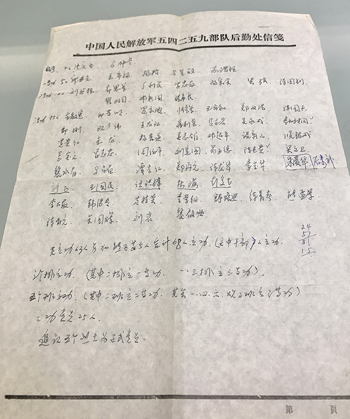 “我把步兵班派出去以后,带着一个重机枪班也往前移动,占领有利位置继续阻击敌人,压制敌人的进攻,封锁敌人向我靠前。一个机枪班,其实也就一挺机枪,战斗力有限,而前面的敌人还想往主攻收复的446高地移动,这时情况非常危险,我不断地联系连、营指挥所,请求炮火拦阻射击。就这样打了一个多小时,另一个排长带着两个班上来支援了,我就马上跟那个排长交代任务,一定要把所有烈士、伤员全部抢回来,把敌人压制住。这场战斗打完,我这个班差不多全部负伤”。说起这场战斗,说起起牺牲的战友,张庆生不停地抚摸着手中那张便签纸,那是当年他记录全连战友的名单,上面记有立功的战友,有牺牲的战友,这张便签纸张庆生一直保存到现在。
